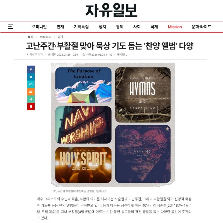 [기획기사] 고난주간·부활절 맞아 묵상 기도 돕는 ‘찬양 앨범’ 다양(자유일보)