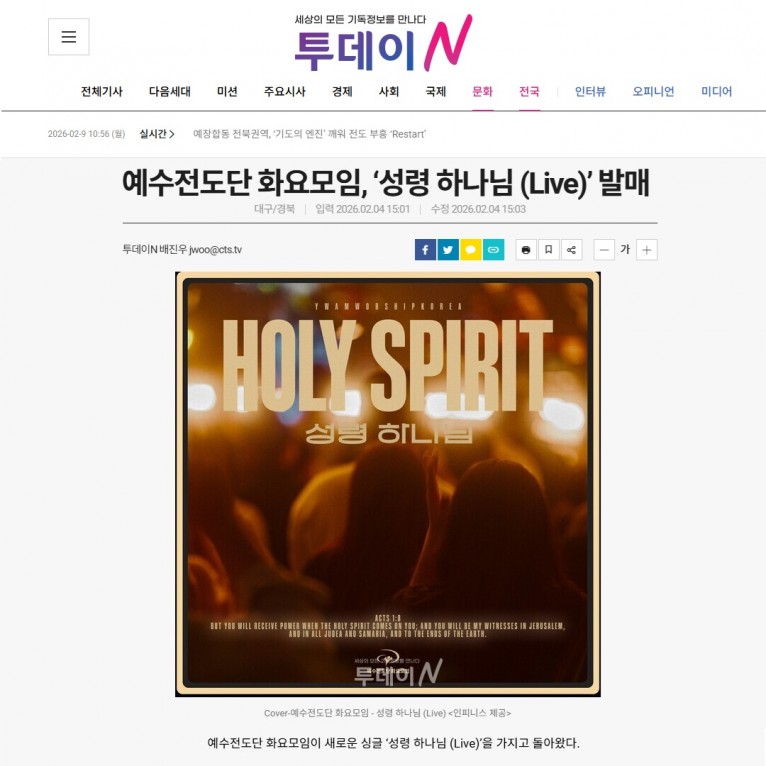 뮤직타임 [기사] 예수전도단 화요모임, ‘성령 하나님 (Live)’ 발매(투데이N 기독교텔레비전)
