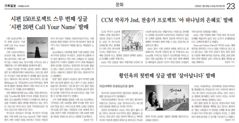 뮤직타임 [기사] CCM 작곡가인 Jnd, ‘아 하나님의 은혜로’ 발매(기독일보)